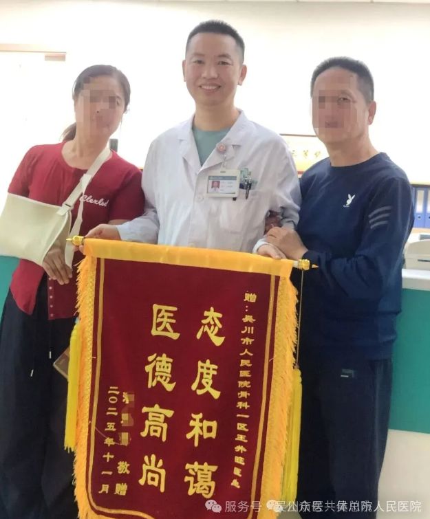 近日,我院骨外科一区的病房里暖意融融,患者潘阿姨(化名)带着家人,将一面绣有“态度和蔼 医德高尚”的锦旗郑重地送到王井旺主治医师手中,红底金字的锦旗不仅承载着患者的满心感激,更见证了“百千万工程”赋能基层医疗的民生实效。